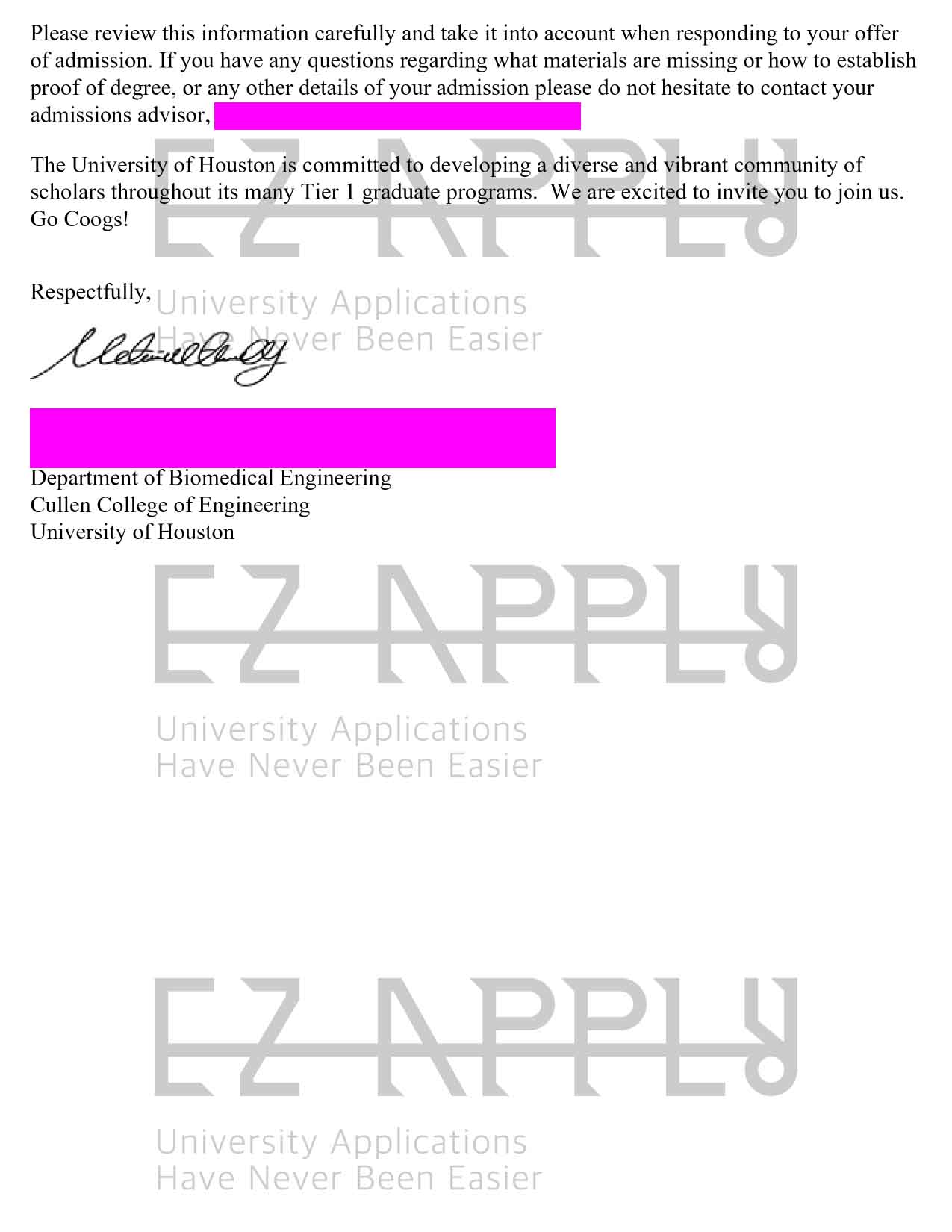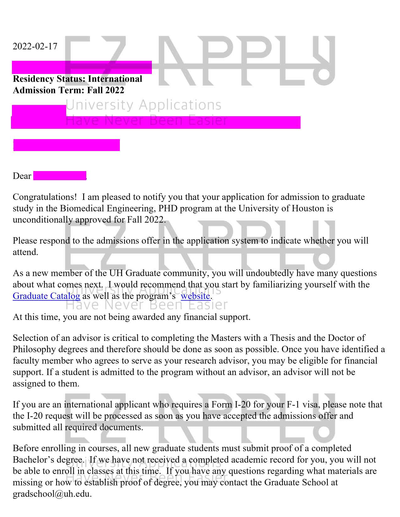 - اخذ پذیرش توسط تیم «ایزی اپلای» در مقطع دکتری در رشته «مهندسی زیست پزشکی (Biomedical Engineering)» از «Houston» در آمریکا برای ترم پاییز 2022