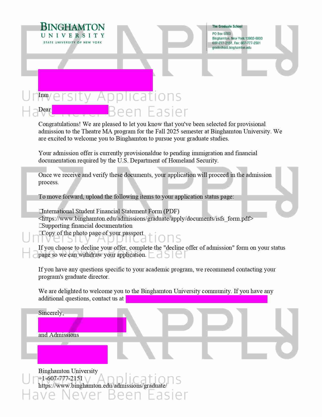 اخذ ادمیــشن توسط تیم ایزی اپلای در مقطع «کارشناسی ارشد» در رشته‌ی «Theatre» از Binghamton University در آمریکا برای پاییز ۲۰۲۵