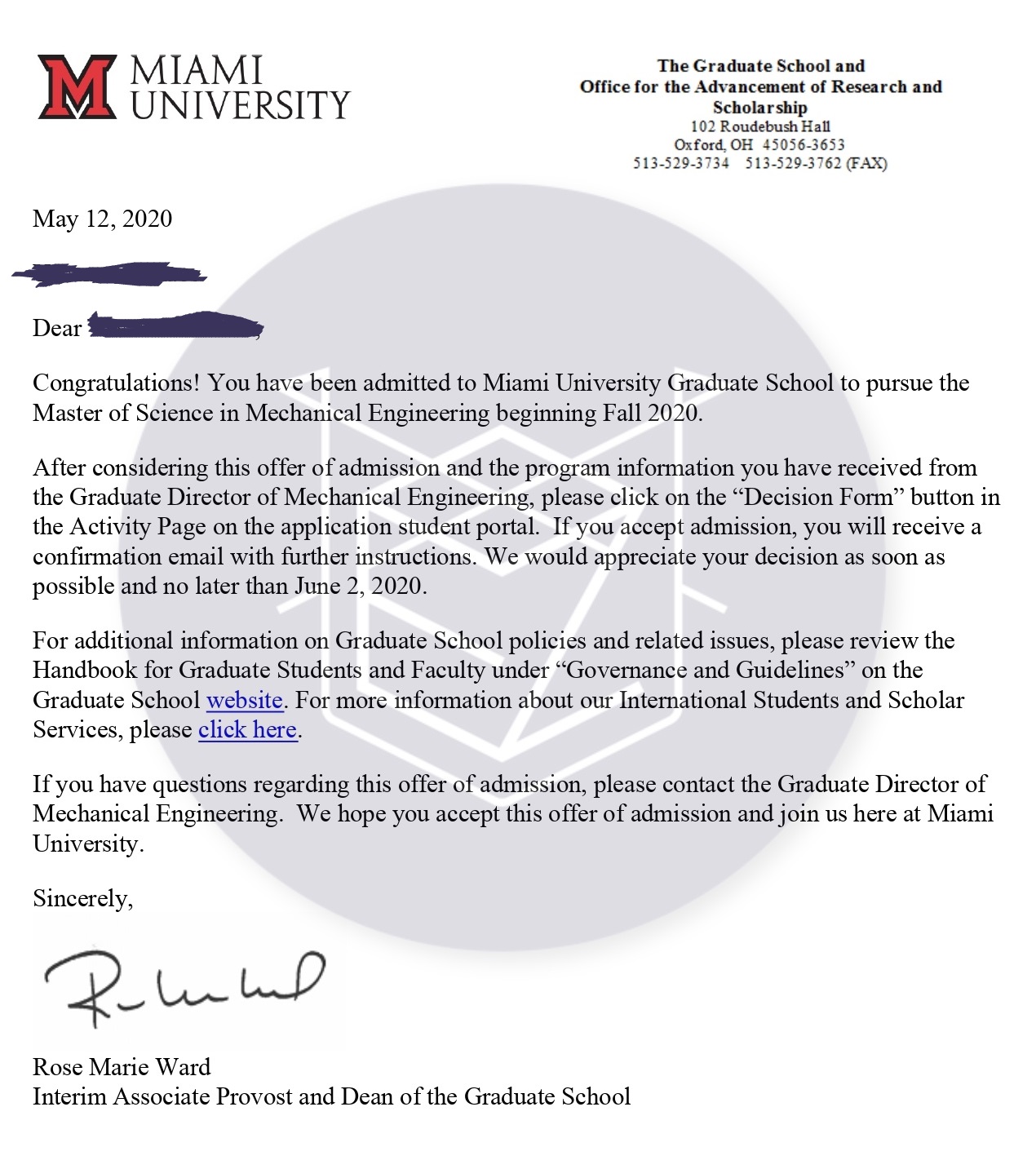اخذ پذیرش توسط تیم «ایزی اپلای» در مقطع کارشناسی ارشد در رشته «مهندسی مکانیک» از دانشگاه « Miami Ohio» آمریکا برای ترم پاییز 2020