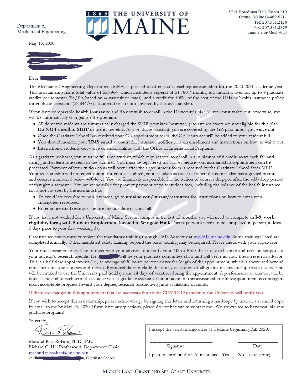 پیشنهاد فاند TA توسط یکی از اساتید دپارتمان داده شد که باتوجه به اکسپت کردن دانشگاه دیگر پیش از این آفر، متقاضی مجبور به رد کردن پیشنهاد استاد این دانشگاه شد.