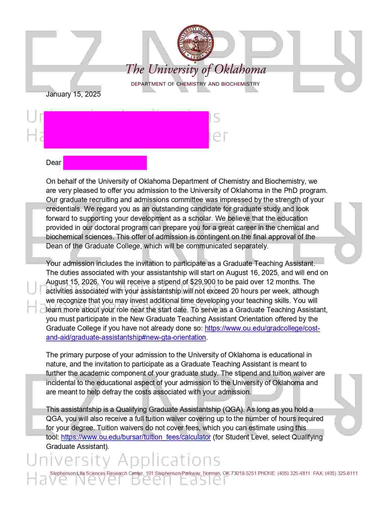 اخذ ادمیــشن فول فاند توسط تیم ایزی اپلای در مقطع «دکتری» در رشته «Chemistry and Biochemistry» از University of Oklahoma در آمریکا برای پاییز ۲۰۲۵
