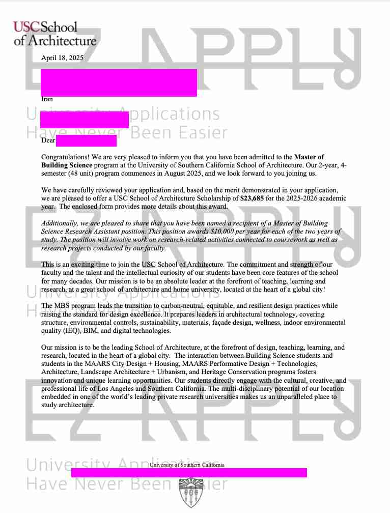 اخذ ادمیــشن با فاند توسط تیم ایزی اپلای در مقطع کارشناسی ارشد در رشتهی «Building Science» از University of Southern California در آمریکا برای پاییز ۲۰۲۵