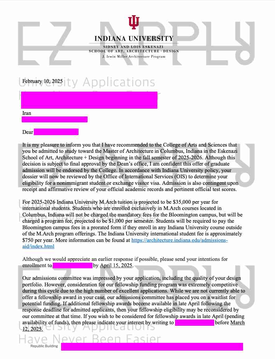 اخذ پذیرش توسط تیم ایزی اپلای در مقطع «کارشناسی ارشد» در رشتهی «Architecture» از Indiana University از آمریکا برای پاییز ۲۰۲۵