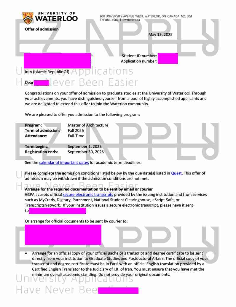 اخذ پذیرش با فاند توسط تیم ایزی اپلای در مقطع «کارشناسی ارشد» در رشتهی «Architecture» از University of Waterloo از کانادا برای پاییز ۲۰۲۵
