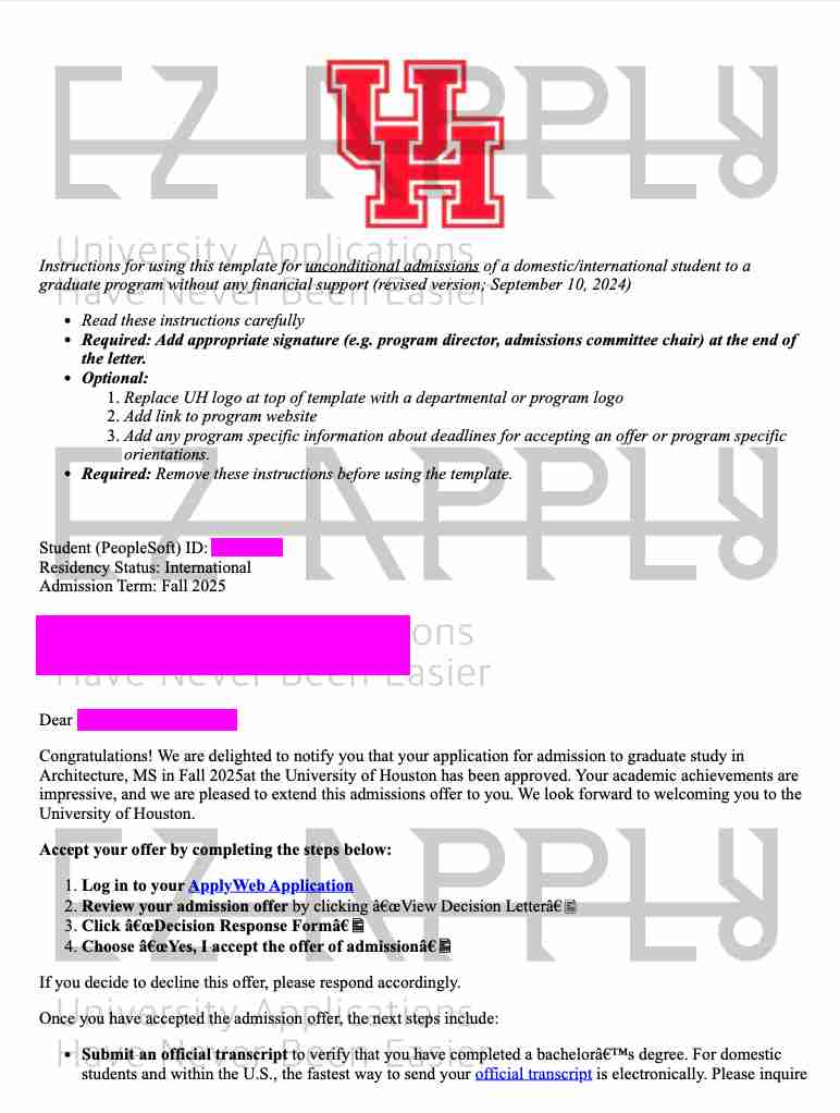 اخذ پذیرش توسط تیم ایزی اپلای در مقطع «کارشناسی ارشد» در رشتهی «Architecture» از University of Houston از آمریکا برای پاییز ۲۰۲۵