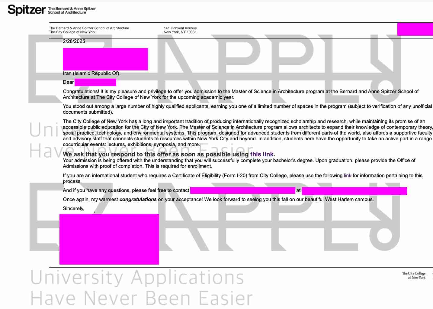 اخذ پذیرش توسط تیم ایزی اپلای در مقطع «کارشناسی ارشد» در رشتهی «Architecture» از The City College of New York از آمریکا برای پاییز ۲۰۲۵
