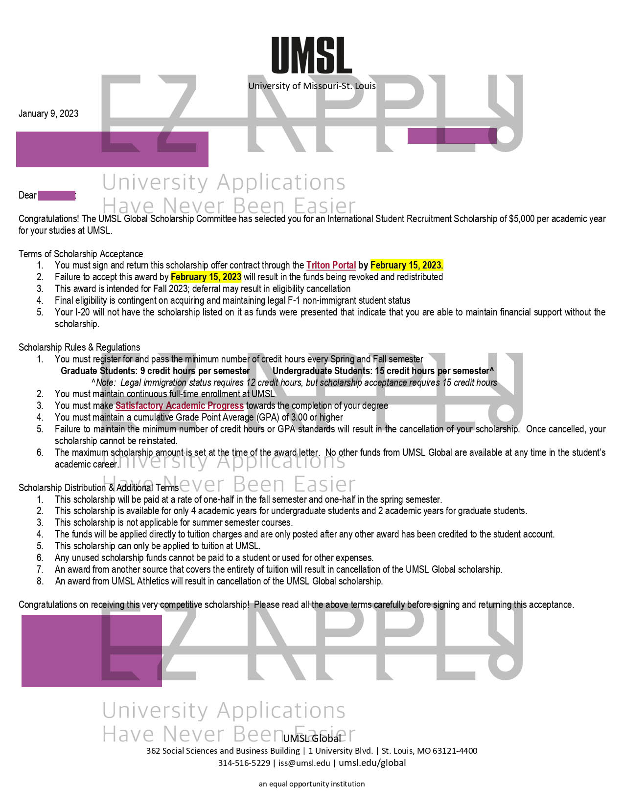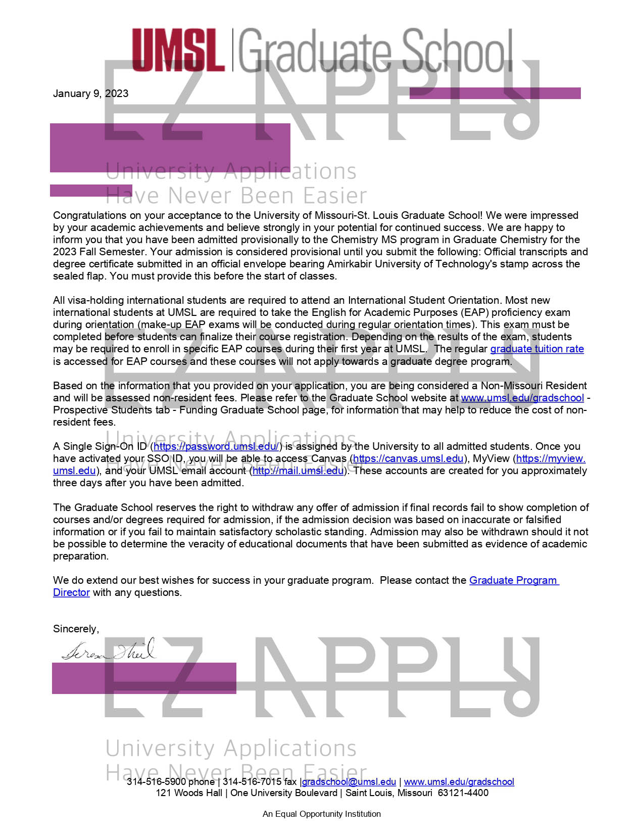 اخذ پذیرش با فاند توسط تیم «ایزی اپلای» در مقطع کارشناسی ارشد در رشته «شیمی» از «University of Missouri–St. Louis» در آمریکا برای پاییز 2023