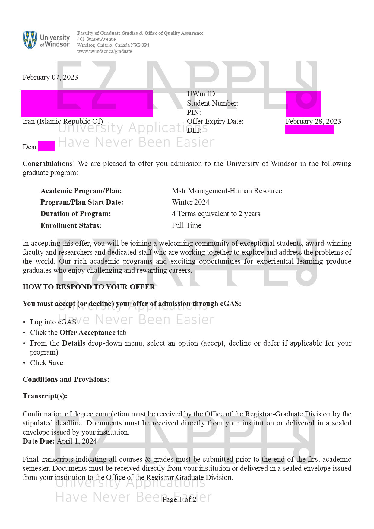 اخذ پذیرش توسط تیم «ایزی اپلای» در مقطع «کارشناسی ارشد» در رشته ی «مدیریت-منابع انسانی» از دانشگاه «University of Windsor» در کانادا برای ترم زمستان 2024