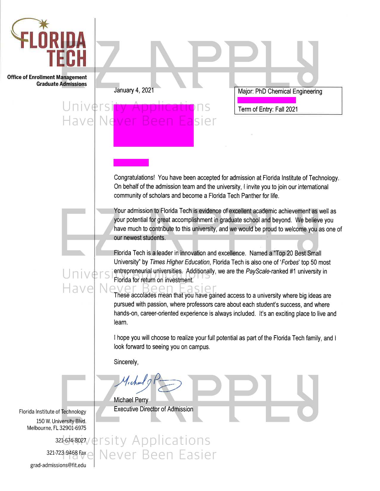 - اخذ پذیرش توسط تیم «ایزی اپلای» در مقطع دکتری در رشته «مهندسی شیمی» از