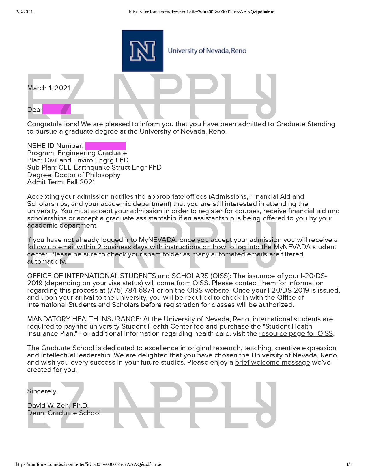 - اخذ پذیرش توسط تیم «ایزی اپلای» در مقطع دکتری در رشته «مهدسی عمران» از دانشگاه «Nevada, Reno» در آمریکا برای ترم پاییز 2021