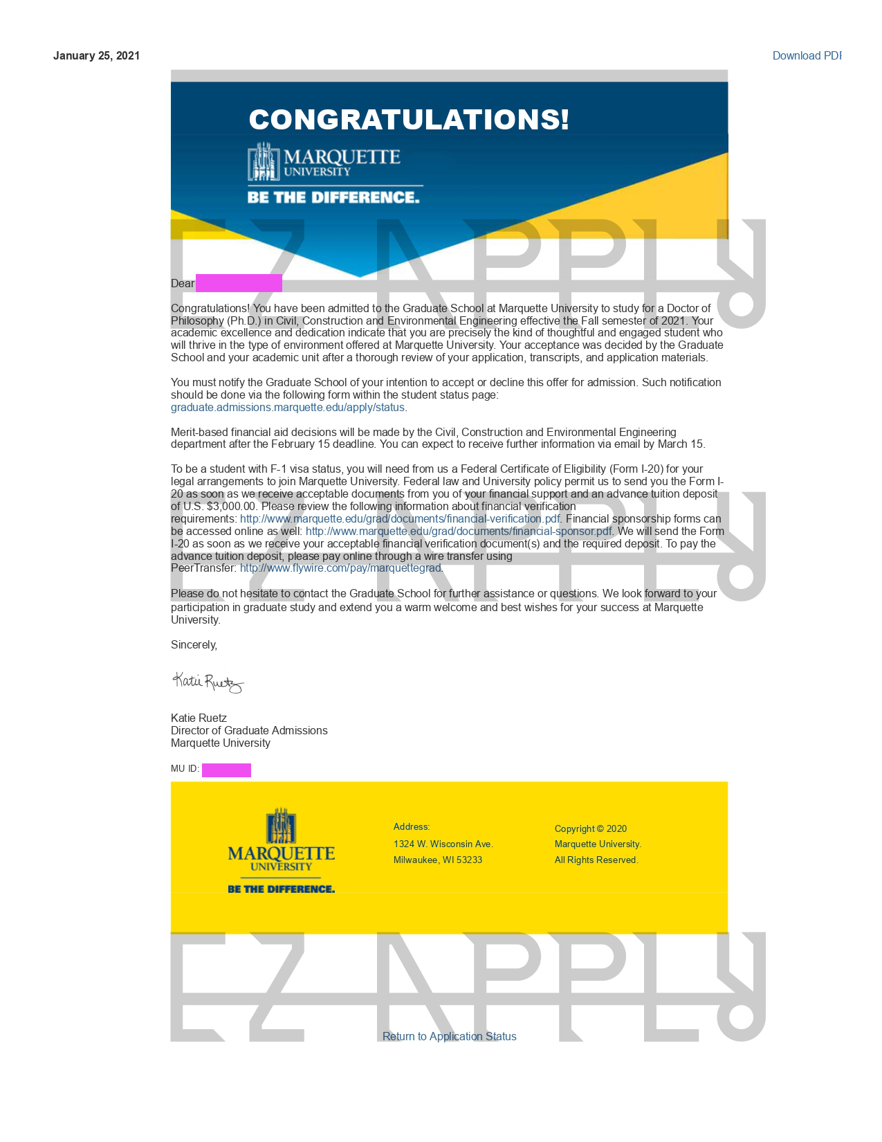 - اخذ پذیرش توسط تیم «ایزی اپلای» در مقطع دکتری در رشته «مهندسی عمران و محیط زیست» از دانشگاه «Marquette» در آمریکا برای ترم پاییز 2021