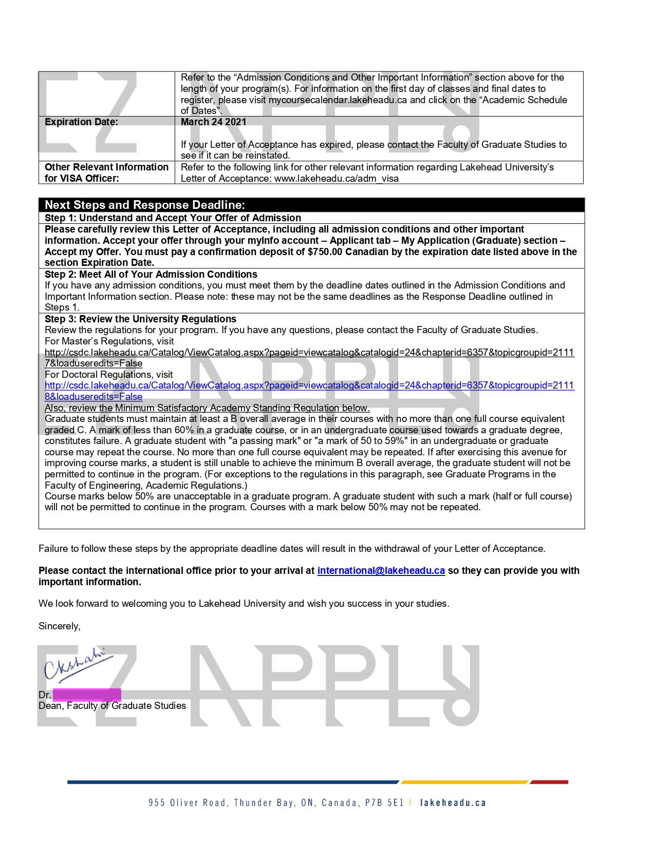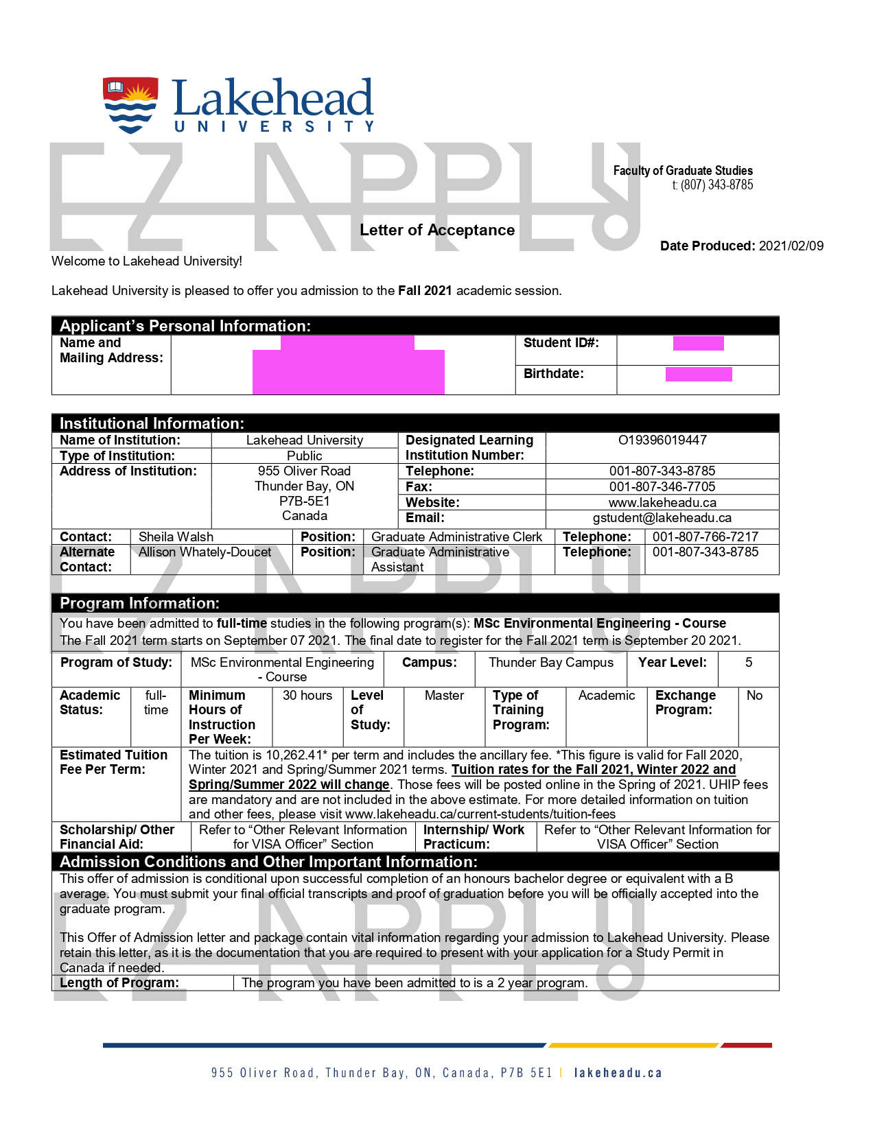 اخذ پذیرش توسط تیم «ایزی اپلای» در مقطع کارشناسی ارشد در رشته «مهندسی بهداشت» از دانشگاه «Lakehead» در کانادا برای ترم پاییز 2021
