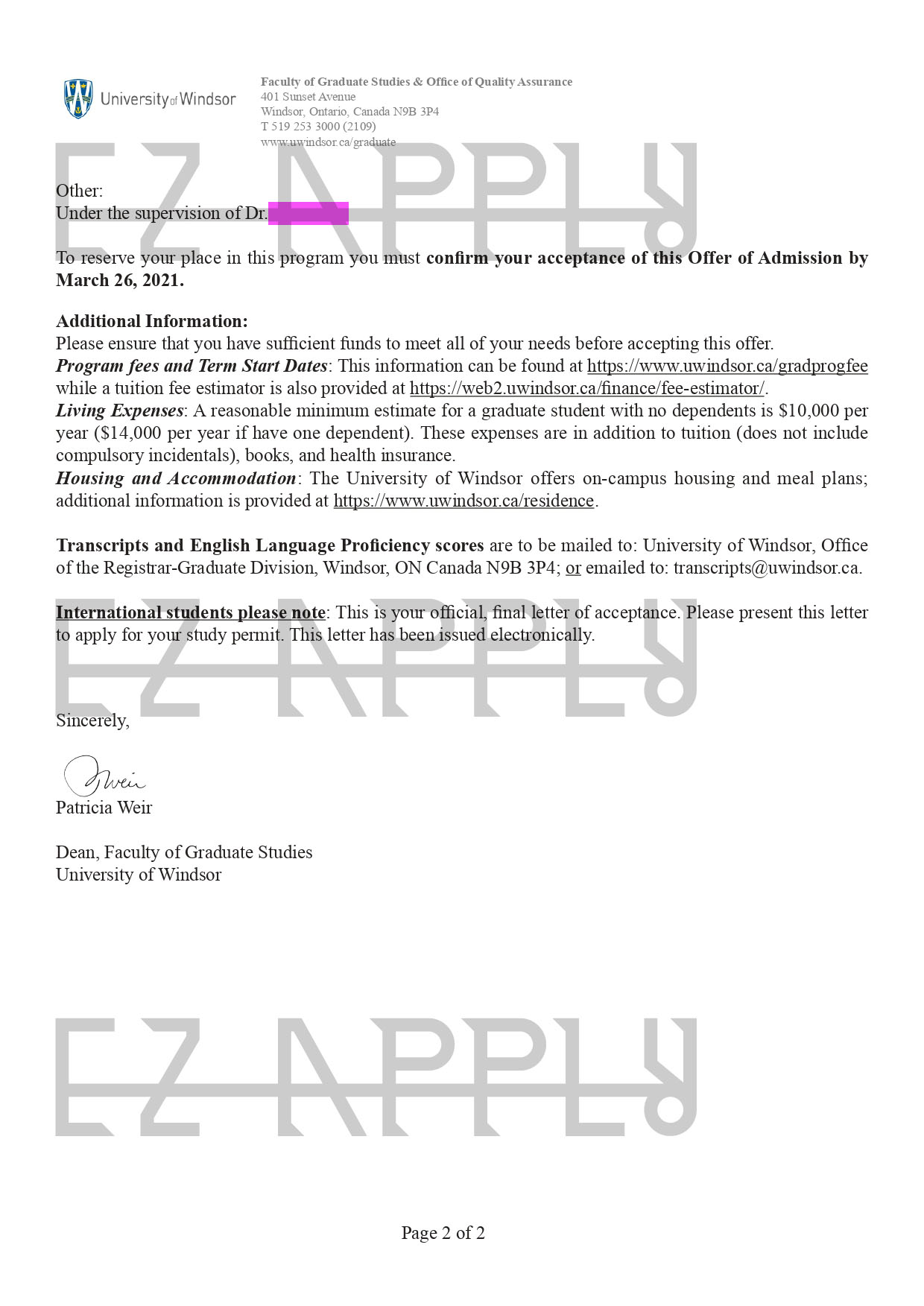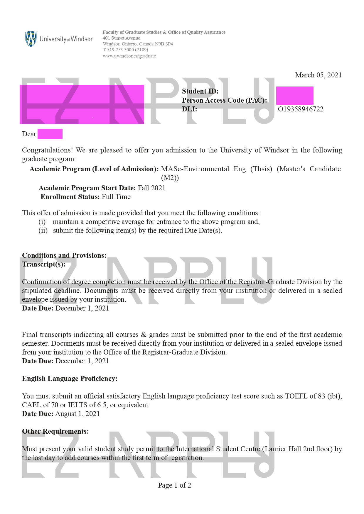 اخذ پذیرش توسط تیم «ایزی اپلای» در مقطع کارشناسی ارشد در رشته «مهندسی بهداشت» از دانشگاه «Windsor» در