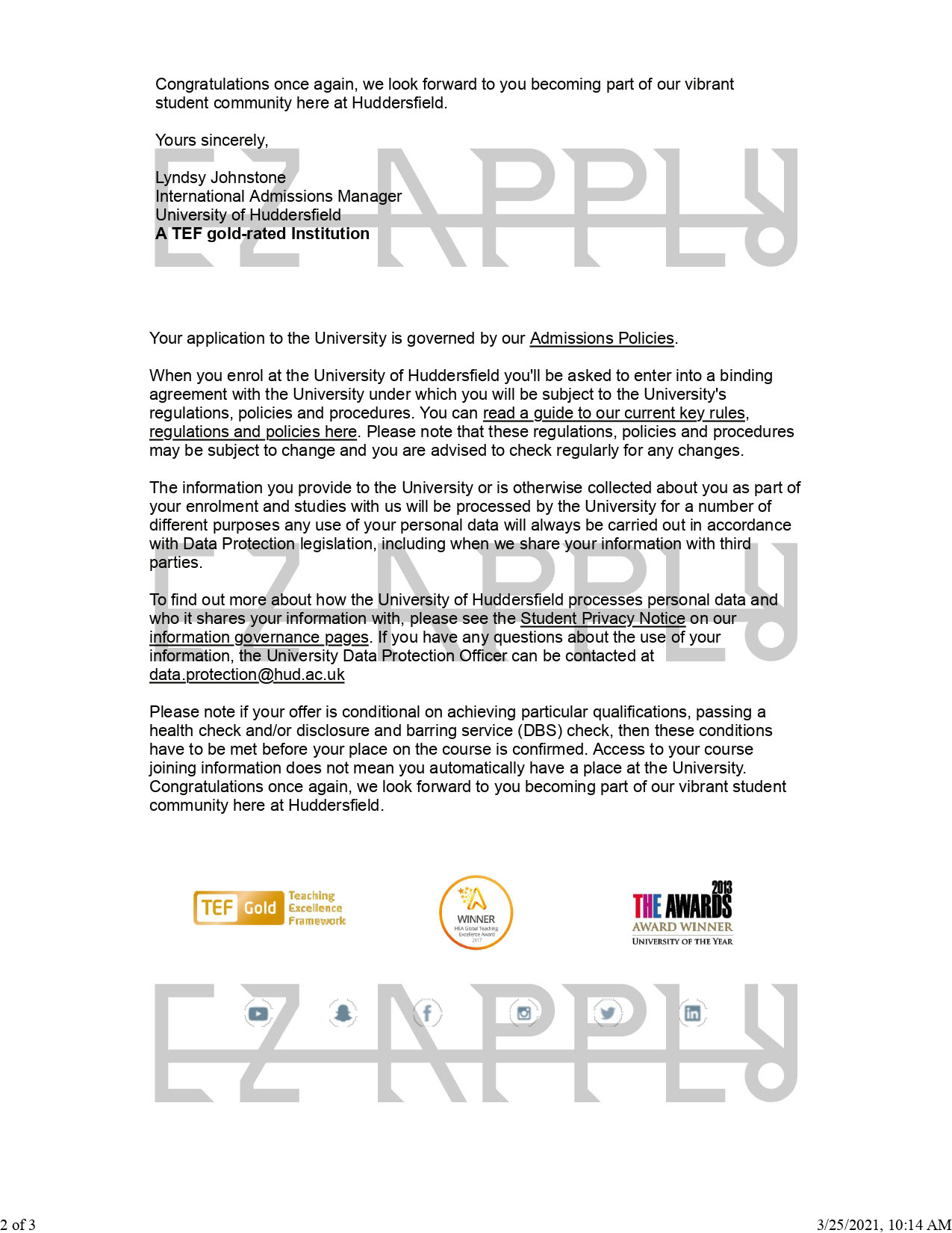 - اخذ پذیرش توسط تیم «ایزی اپلای» در مقطع کارشناسی ارشد در رشته «مدیریت کسب و کار» از دانشگاه «Huddersfield» در انگلیس برای ترم پاییز 2021