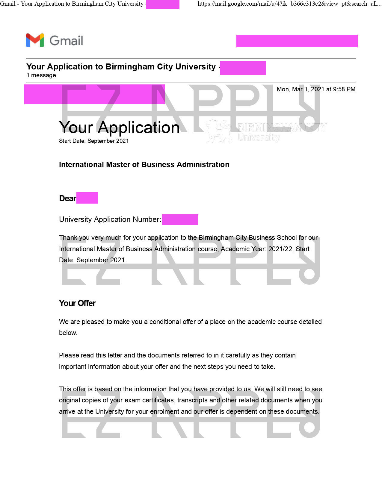 - اخذ پذیرش توسط تیم «ایزی اپلای» در مقطع کارشناسی ارشد در رشته «مدیریت کسب و کار» از دانشگاه «Birmingham City» در انگلیس برای ترم پاییز 2021