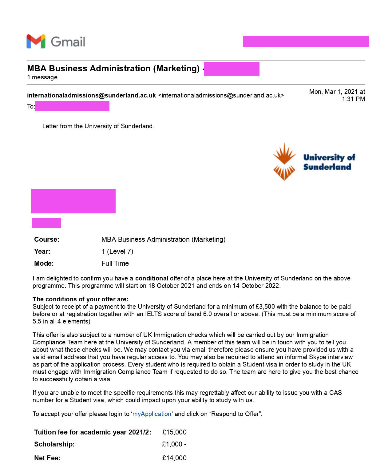 - اخذ پذیرش توسط تیم «ایزی اپلای» در مقطع کارشناسی ارشد در رشته «مدیریت کسب و کار» از دانشگاه «Sunderland» در انگلیس برای ترم پاییز 2021