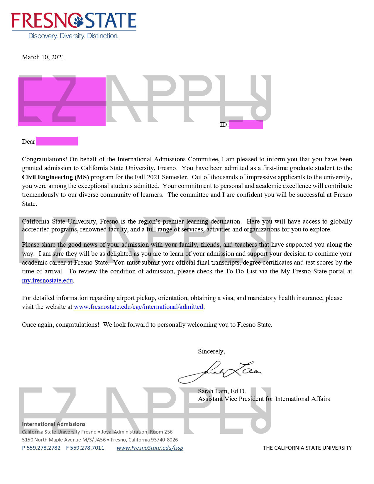اخذ پذیرش توسط تیم «ایزی اپلای» در مقطع کارشناسی ارشد در رشته «مهندسی عمران» از دانشگاه «California State University, Fresno» در آمریکا برای ترم پاییز 2021