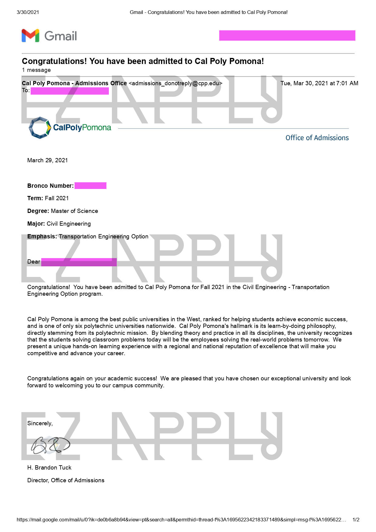 اخذ پذیرش توسط تیم «ایزی اپلای» در مقطع کارشناسی ارشد در رشته «مهندسی عمران» از دانشگاه «California State Polytechnic University, Pomona» در آمریکا برای ترم پاییز 2021