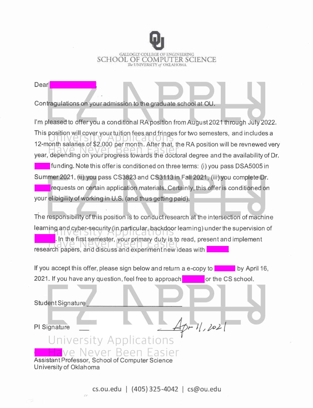 • اخذ پذیرش فول فاند توسط تیم «ایزی اپلای» در مقطع دکتری در رشته «علوم کامپیوتر» از «Oklahoma» در آمریکا برای ترم پاییز 2021