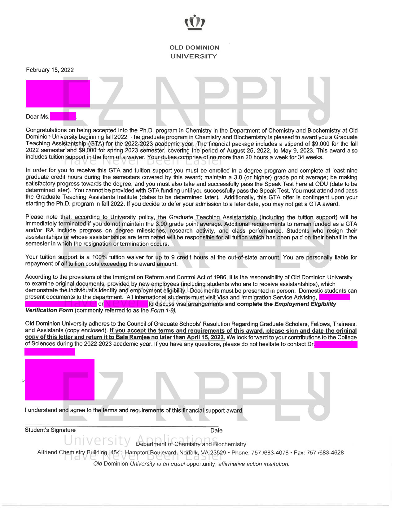 اخذ پذیرش با فاند توسط تیم «ایزی اپلای» در مقطع دکتری «شیمی» از دانشگاه «Old Dominion University» آمریکا برای ترم پاییز 2022