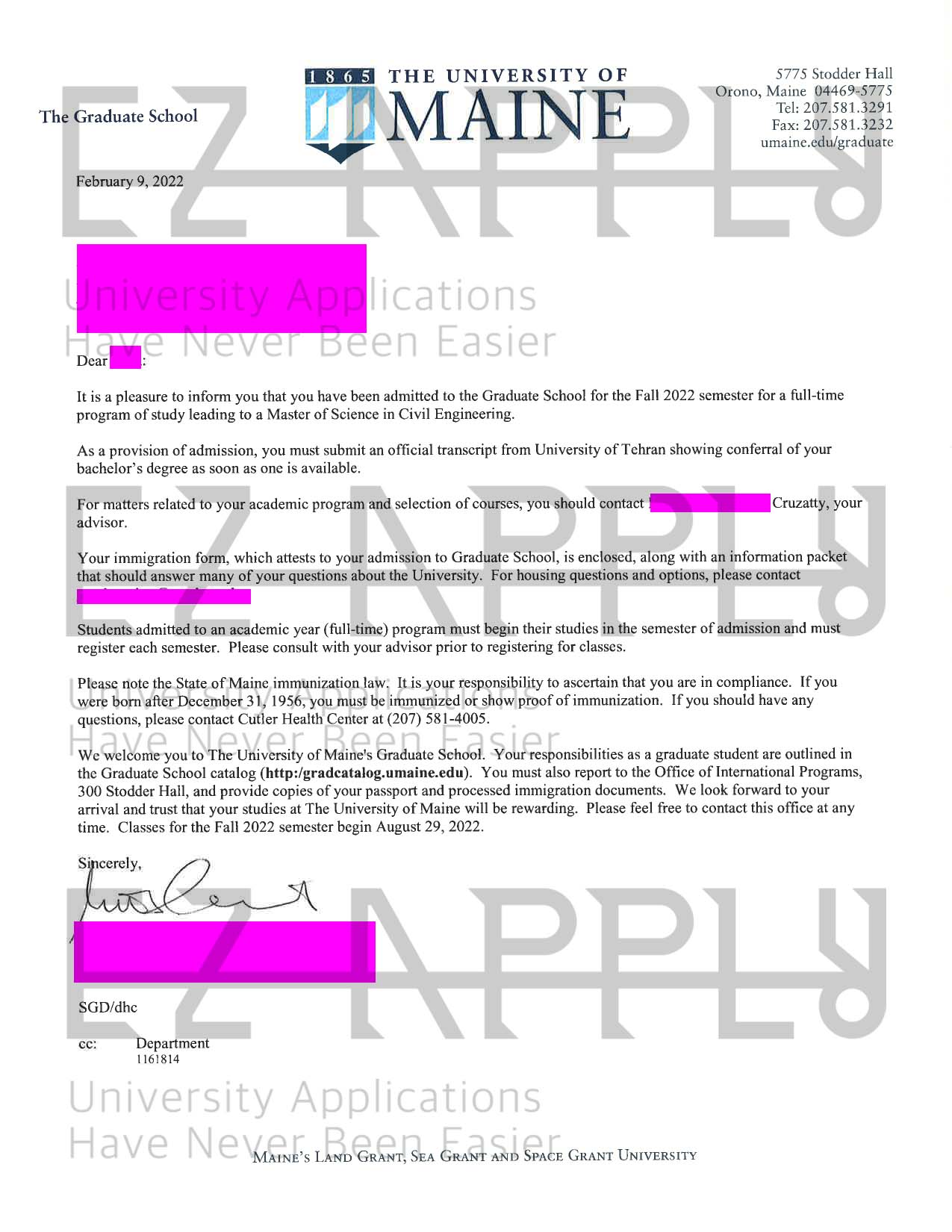 اخذ پذیرش فول فاند توسط تیم «ایزی اپلای» در مقطع کارشناسی ارشد در رشته «مهندسی عمران» از دانشگاه «University of Maine» در آمریکا برای پاییز 2022