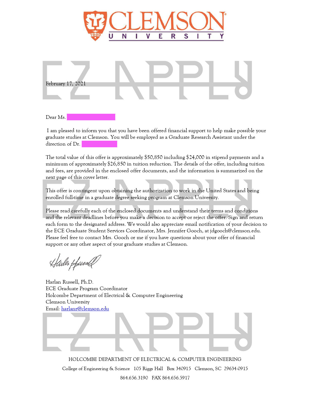 - اخذ پذیرش فول فاند توسط تیم «ایزی اپلای» در مقطع دکتری در رشته «برق» از دانشگاه «CLEMSON» در آمریکا برای ترم پاییز 2021