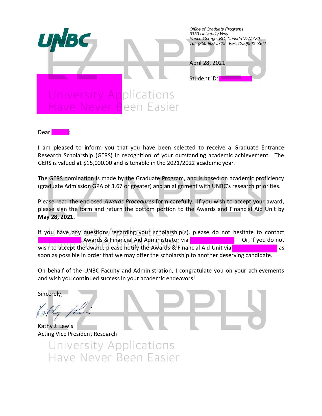 - اخذ پذیرش همراه با فاند توسط تیم «ایزی اپلای» در مقطع کارشناسی ارشد در رشته «مطالعات جنسیت» از «Northern British Columbia» در کانادا برای ترم پاییز 2021