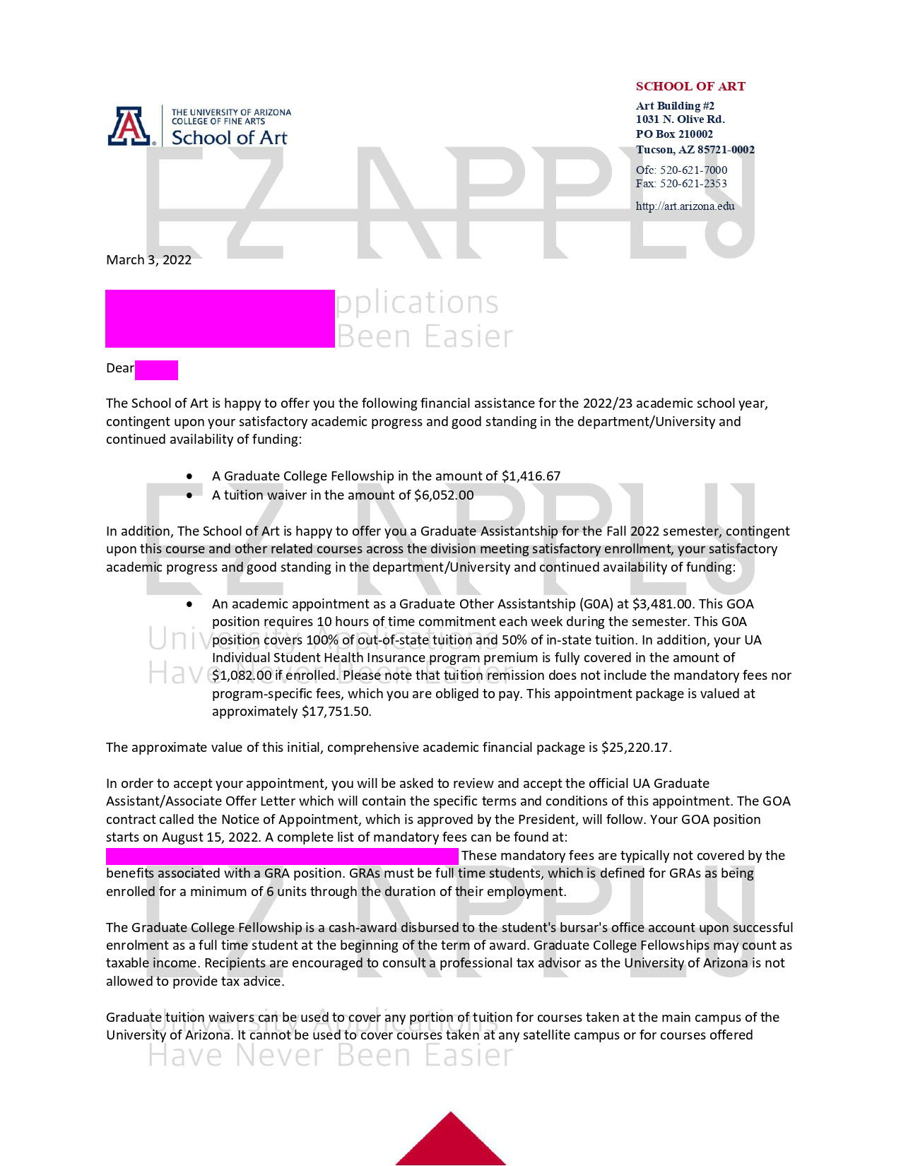 اخذ پذیرش توسط تیم «ایزی اپلای» در مقطع کارشناسی ارشد « تاریخ هنر» از دانشگاه «University of Arizona » آمریکا برای پاییز ۲۰۲۲