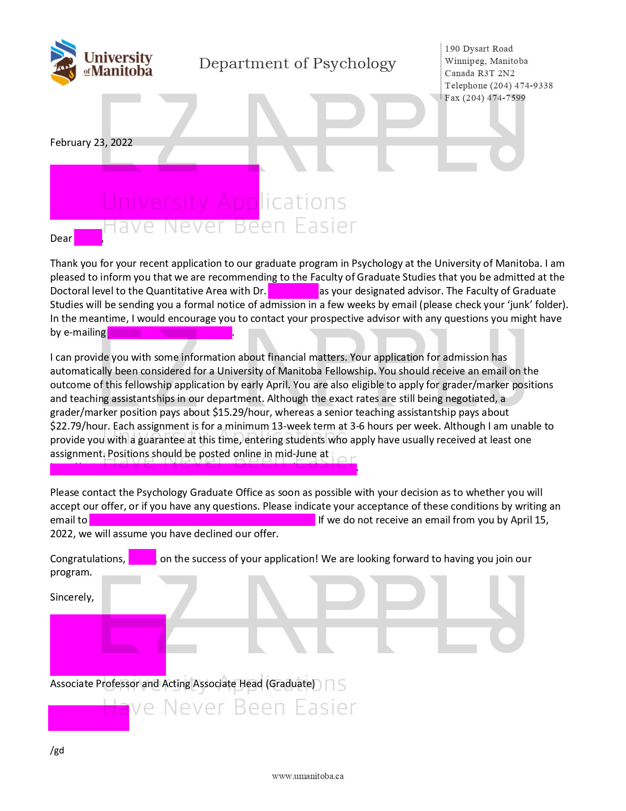 اخذ پذیرش توسط تیم «ایزی اپلای» در مقطع دکتری «روانشناسی» از دانشگاه «University of Manitoba» کانادا برای ترم پاییز 2022