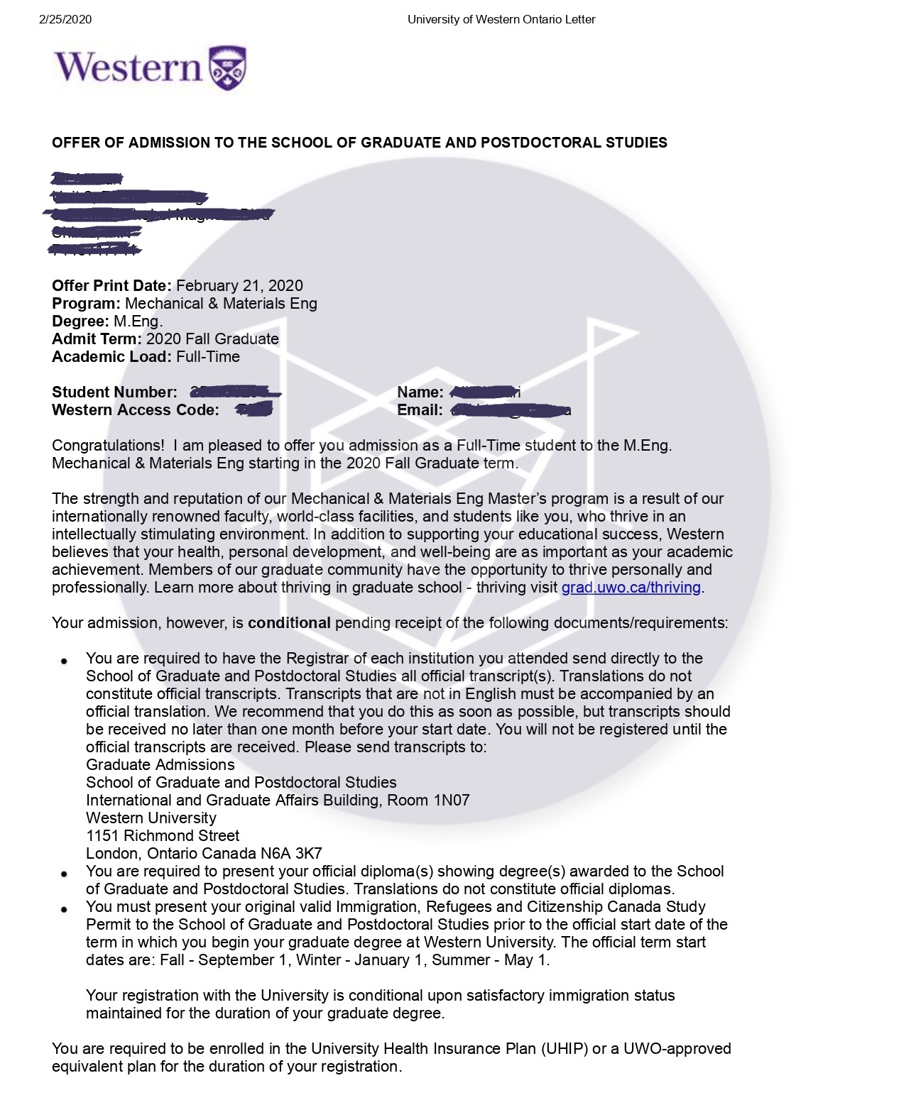 اخذ پذیرش توسط تیم «ایزی اپلای» در مقطع کارشناسی ارشد در رشته مهندسی مکانیک از دانشگاه « Western» کانادا برای ترم پاییز 2020
