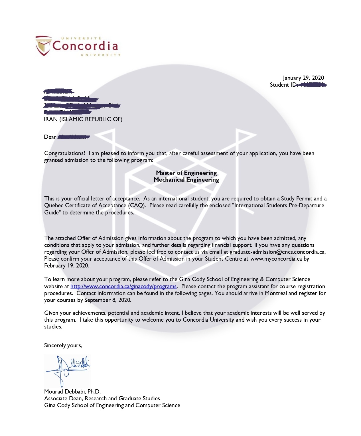 اخذ پذیرش توسط تیم «ایزی اپلای» در مقطع کارشناسی ارشد در رشته مهندسی مکانیک از دانشگاه « Concordia» کانادا برای ترم پاییز 2020
