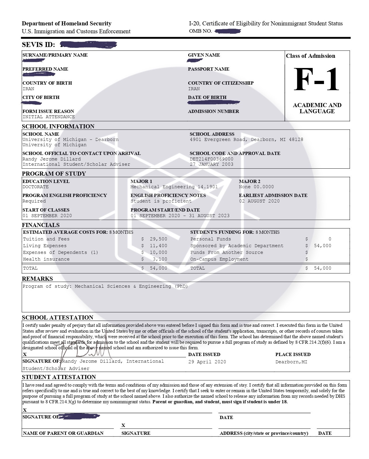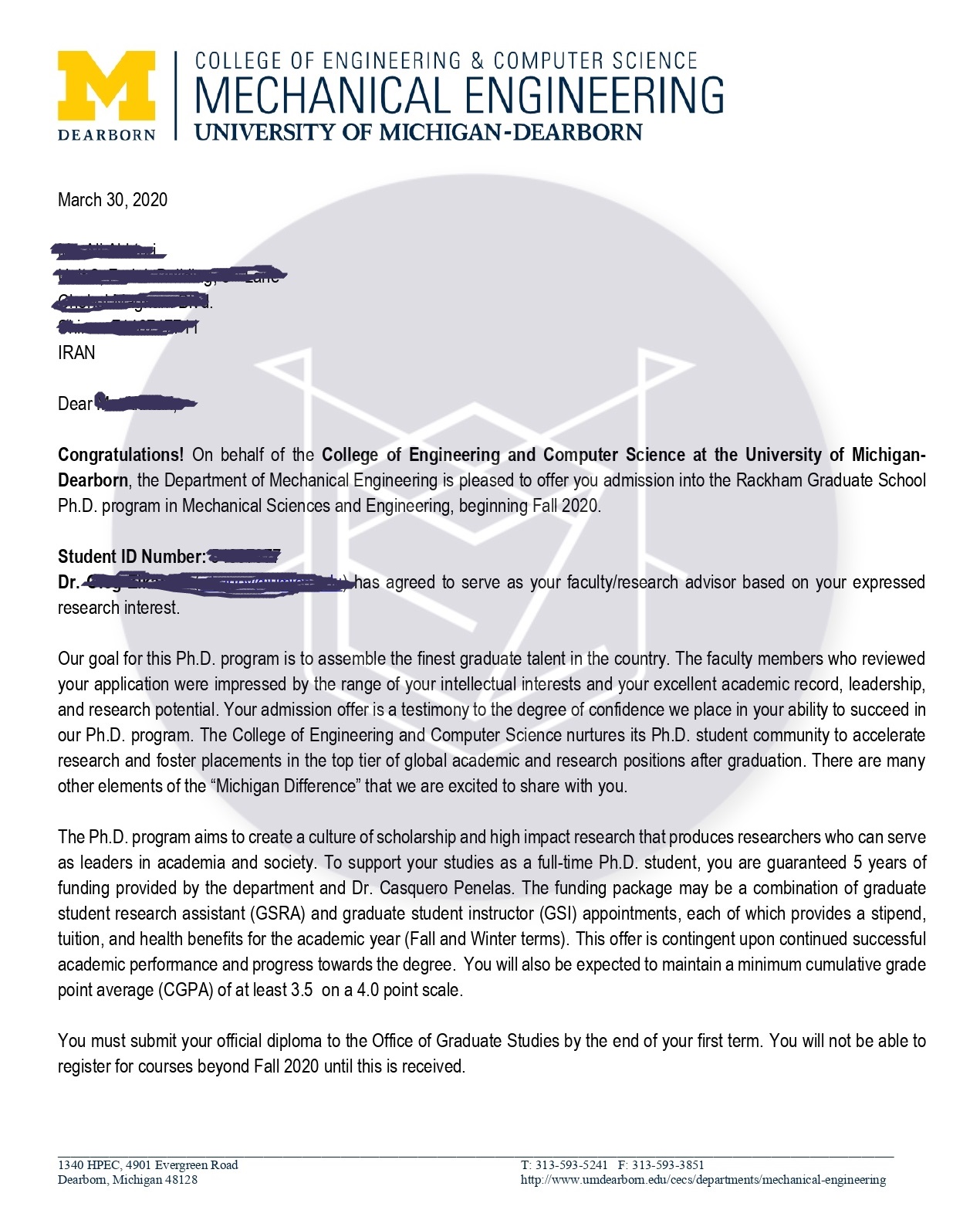 اخذ پذیرش توسط تیم «ایزی اپلای» در مقطع دکترا در رشته مهندسی مکانیک از دانشگاه « Michigan Dearborn» آمریکا برای ترم پاییز 2020