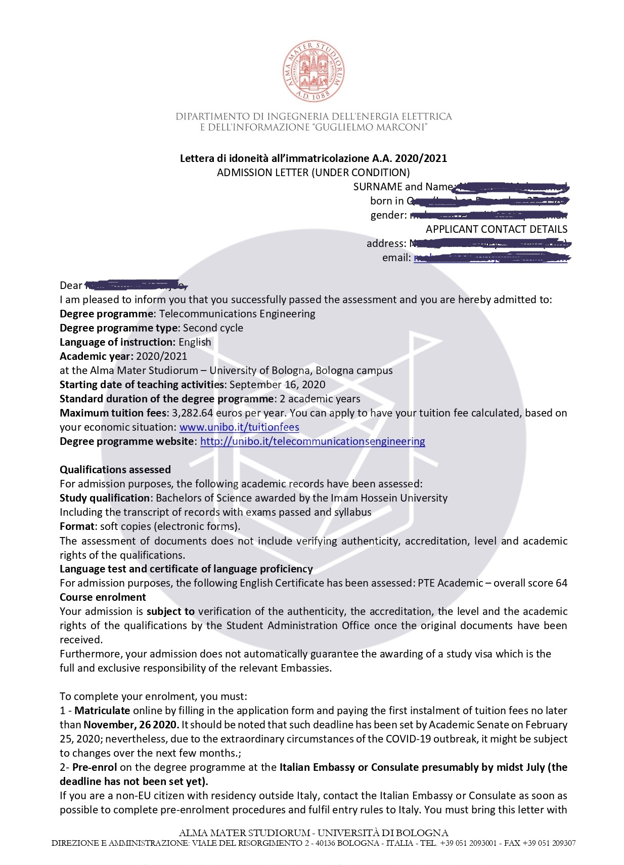 اخذ پذیرش توسط تیم «ایزی اپلای» در مقطع کارشناسی ارشد در رشته مهندسی برق و مخابرات از دانشگاه «Bologna» ایتالیا برای ترم پاییز 2020