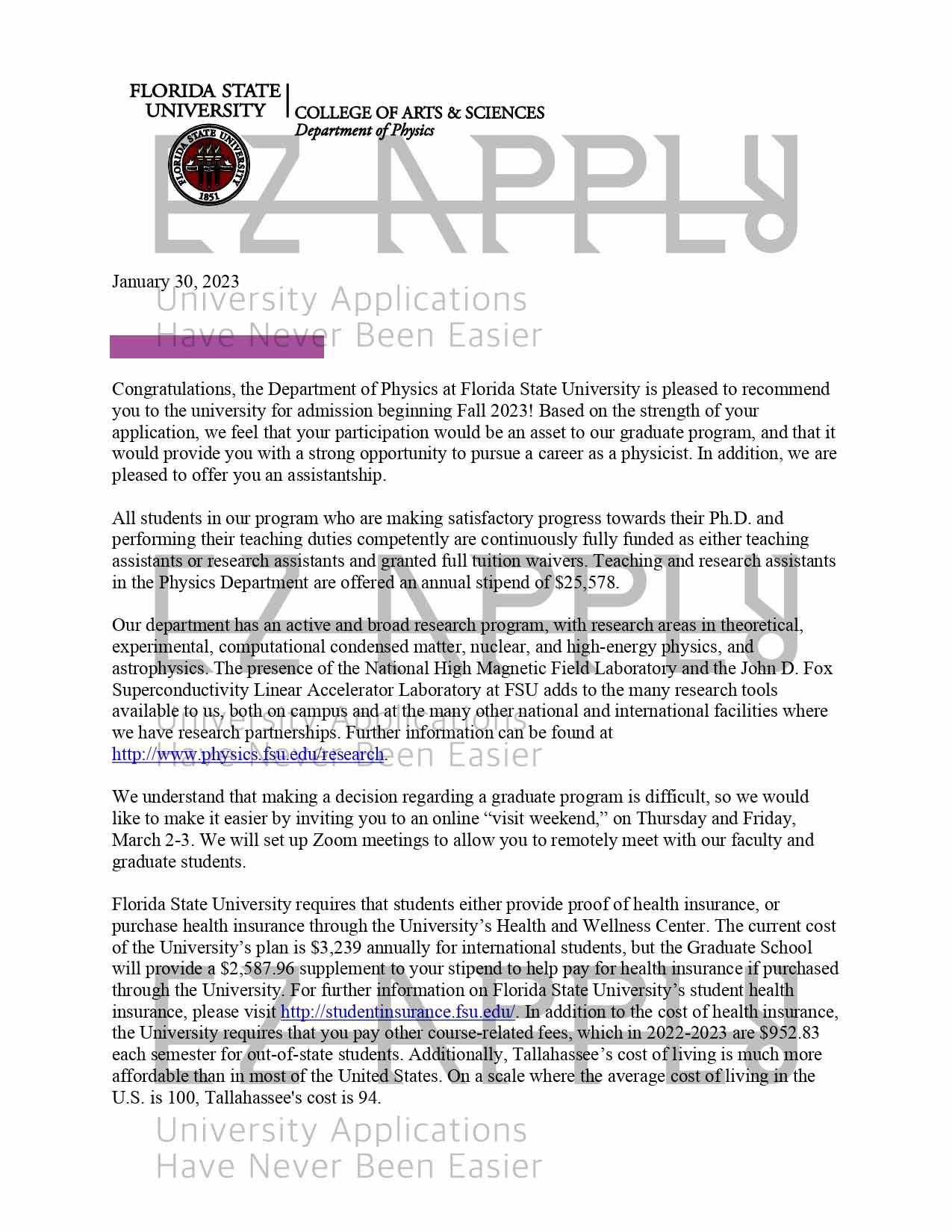 • پذیرش اخذ شده توسط تیم ایزی اپلای در مقطع «دکتری» در رشته «فیزیک» از «Florida State University» در آمریکا برای پاییز 2023