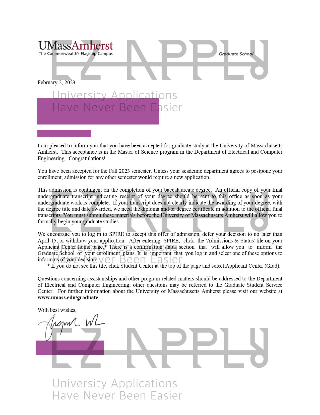 • پذیرش اخذ شده توسط تیم ایزی اپلای در مقطع «کارشناسی ارشد» در رشته «Electrical and Computer Engineering» از «University of Massachusetts Amherst» در آمریکا برای پاییز 2023