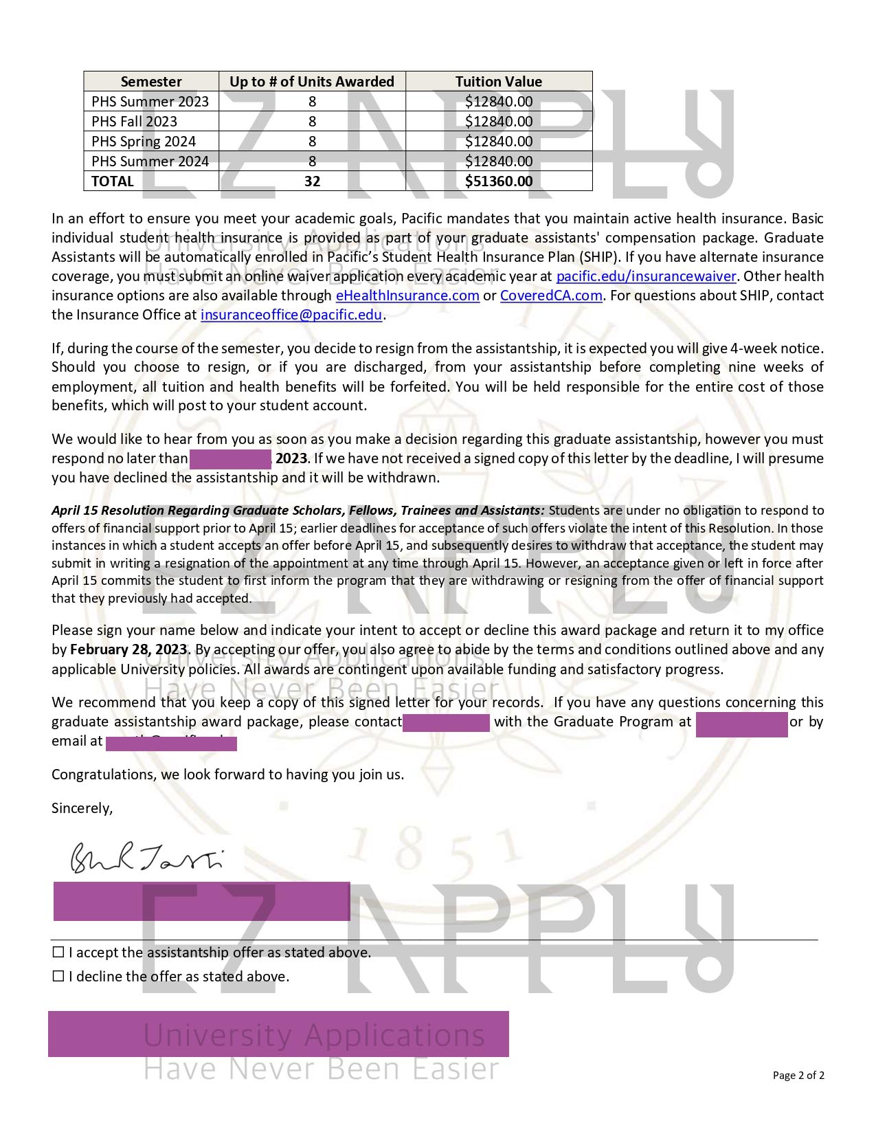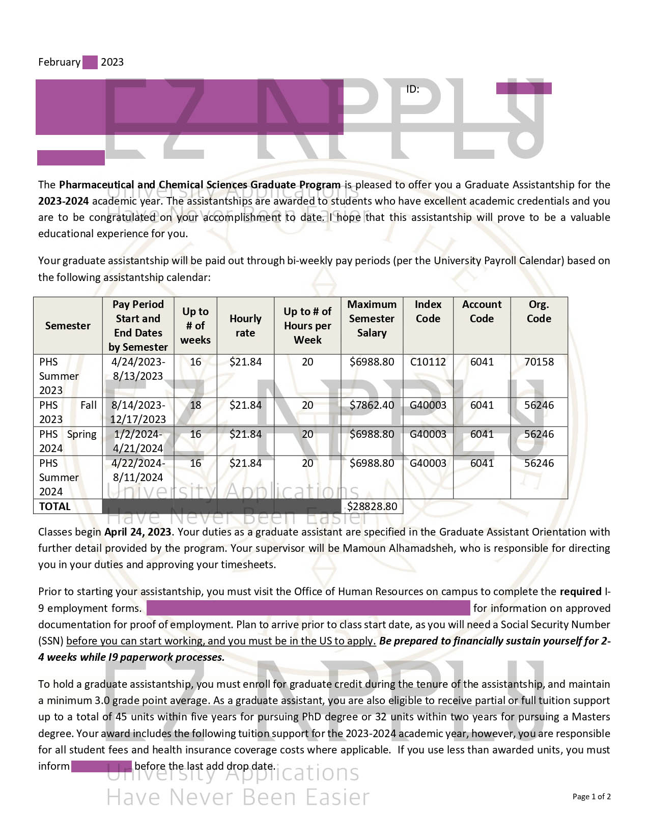 • مقدار فاند GA دریافتی متقاضی برای پرداخت هزینه های زندگی: 28828.80$ از تابستان 2023 تا پایان ترم تابستان 2024