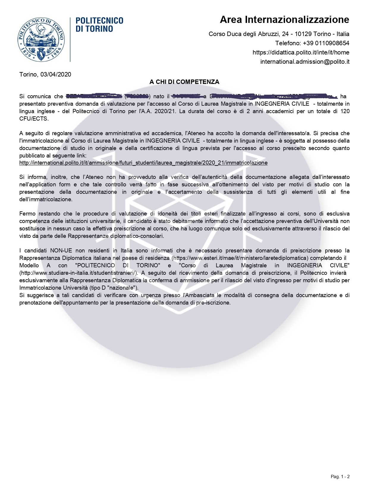 .اخذ پذیرش توسط تیم «ایزی اپلای» در مقطع کارشناسی ارشد در رشته مهندسی عمران از دانشگاه «پلی تکنیک تورین» ایتالیا برای ترم پاییز 2020