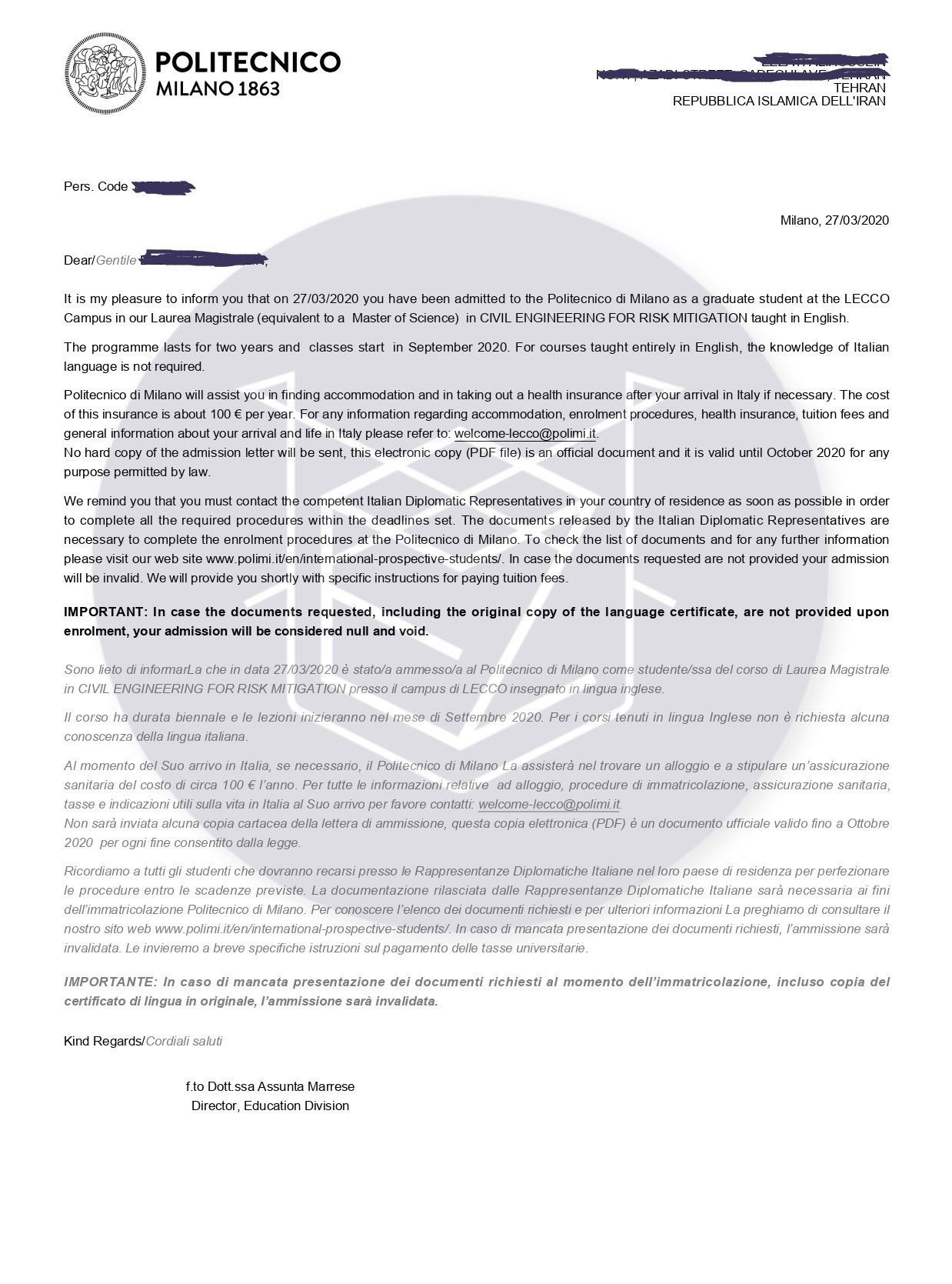 .اخذ پذیرش توسط تیم «ایزی اپلای» در مقطع کارشناسی ارشد در رشته مهندسی عمران از دانشگاه «پلی تکنیک میلان» ایتالیا برای ترم پاییز 2020