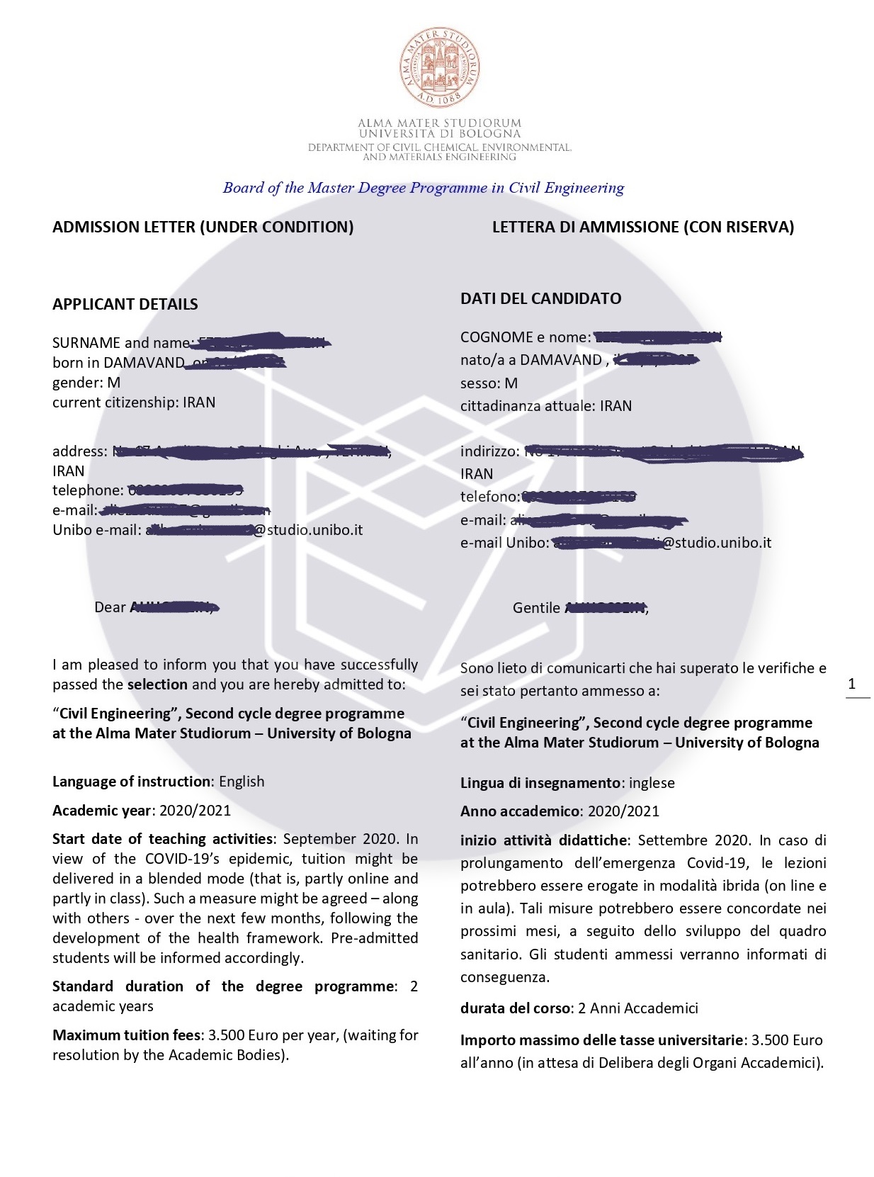 .اخذ پذیرش توسط تیم «ایزی اپلای» در مقطع کارشناسی ارشد در رشته مهندسی عمران از دانشگاه « Bologna» ایتالیا برای ترم پاییز 2020