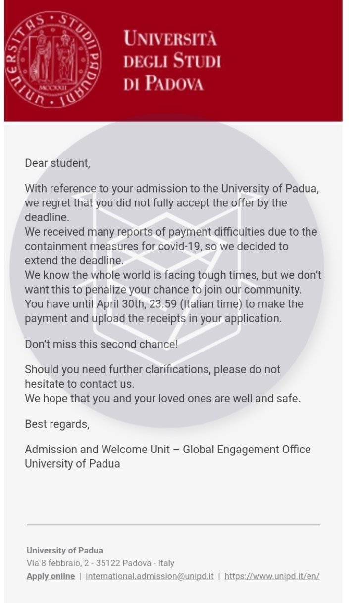 اخذ پذیرش توسط تیم «ایزی اپلای» در مقطع کارشناسی ارشد در رشته مهندسی عمران از دانشگاه «padua» ایتالیا برای ترم پاییز 2020