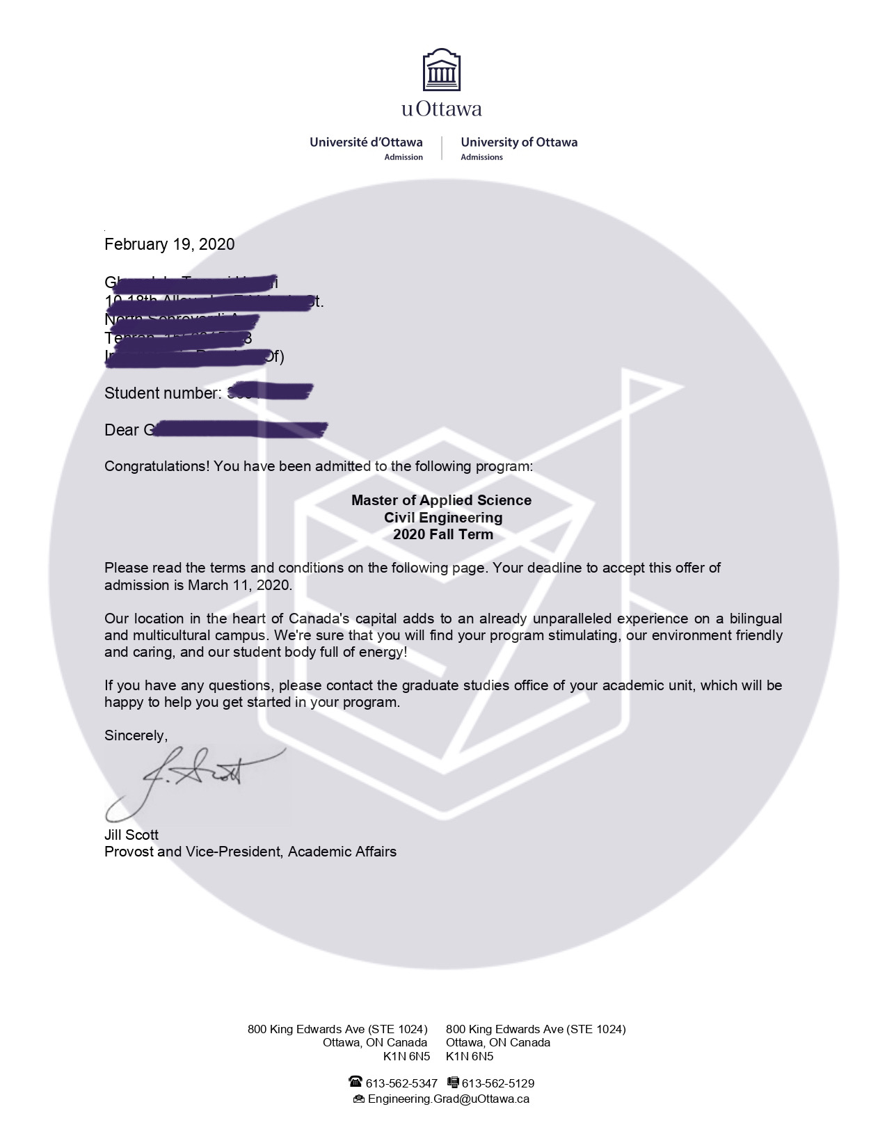 اخذ پذیرش توسط تیم «ایزی اپلای» در مقطع کارشناسی ارشد thesis-based رشته «مهندسی عمران» از دانشگاه «اوتاوا» کانادا برای ترم پاییز 2020- لازم به ذکر است که برای متقاضی در دانشگاه «وسترن اونتاریو» کانادا نیز آفر ادمیشن گرفته شده که به دلیل درخواست خود ایشان لغو شد.