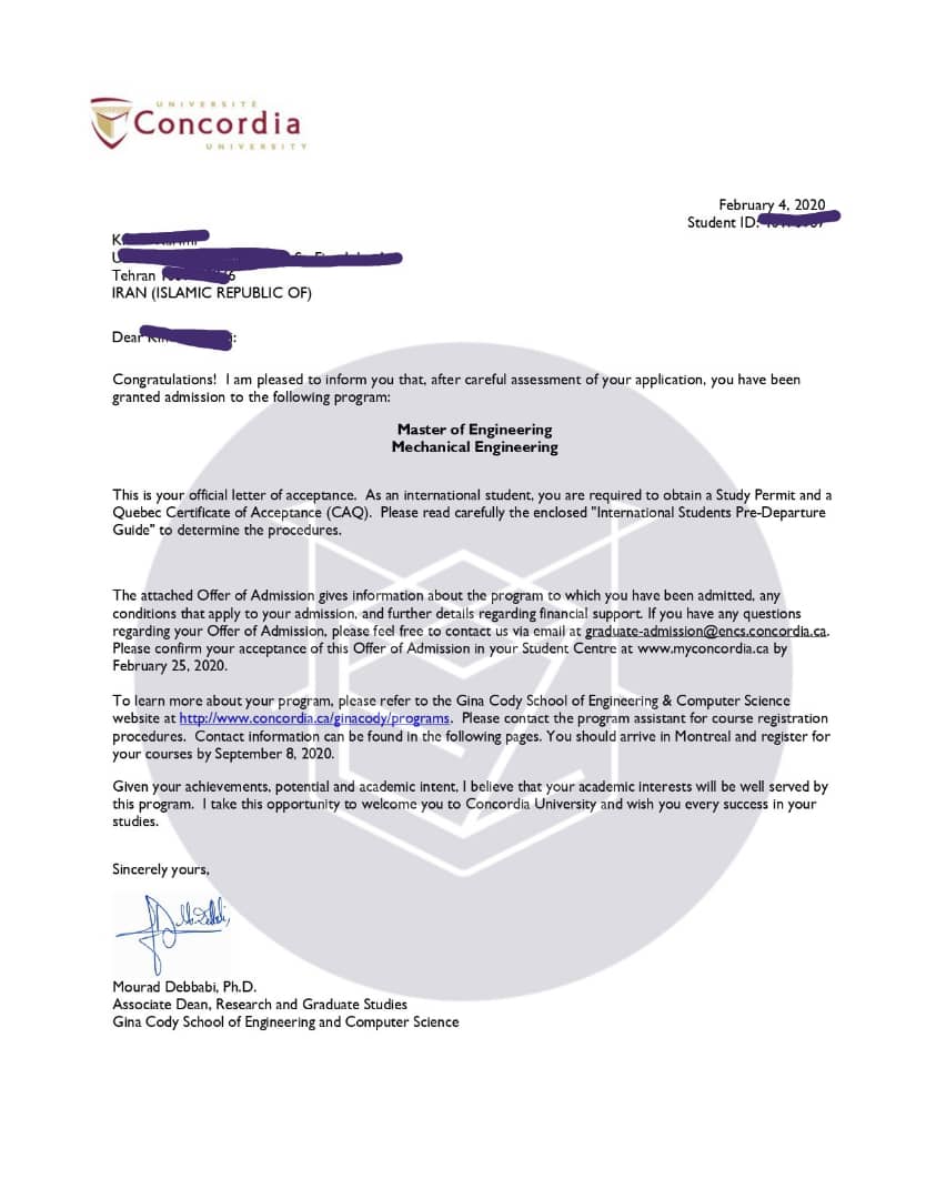 اخذ پذیرش توسط تیم «ایزی اپلای» در مقطع کارشناسی ارشد رشته «مهندسی مکانیک» از دانشگاه «کنکوردیا» کانادا برای ترم پاییز 2020