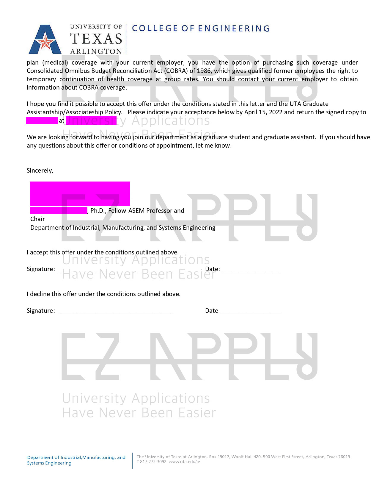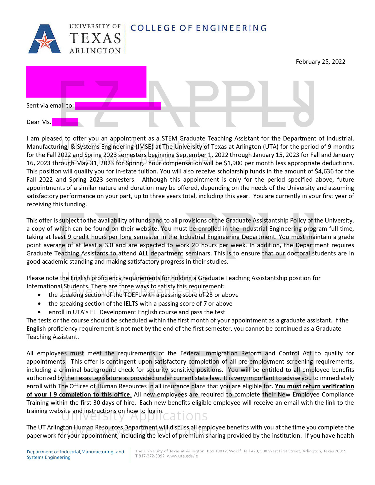 اخذ پذیرش توسط تیم «ایزی اپلای» در مقطع کارشناسی ارشد «مهندسی صنایع، ساخت و ساز و سیستم ها» از دانشگاه «University of Texas at Arlington» آمریکا برای ترم پاییز 2022