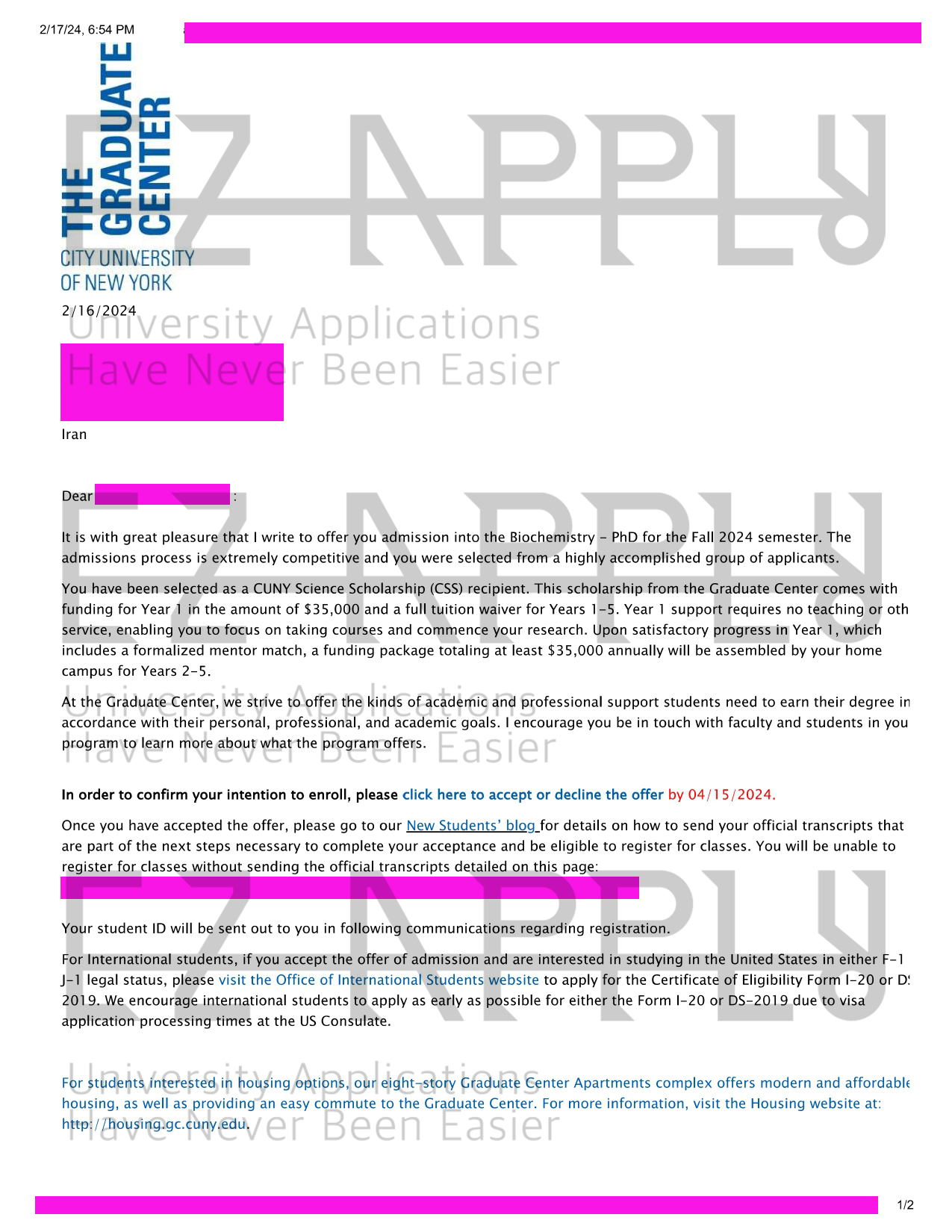 ادمیشن فول فاند اخذ شده توسط تیم ایزی اپلای در مقطع «دکتری» در رشته «Biochemistry» از City University of New York در آمریکا برای پاییز 2024