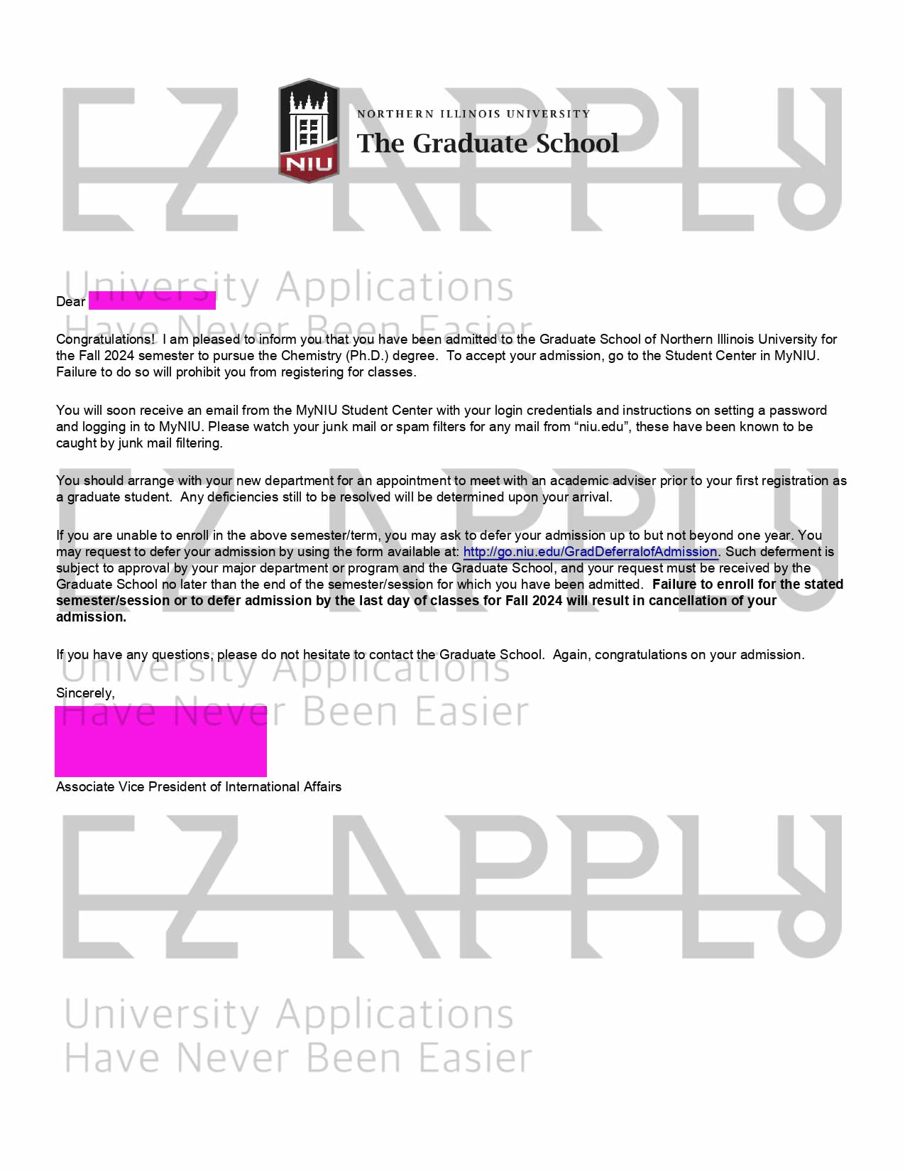 ادمیشن اخذ شده توسط تیم ایزی اپلای در مقطع «دکتری» در رشته «Chemistry» از Northern Illinois University در آمریکا برای پاییز 2024