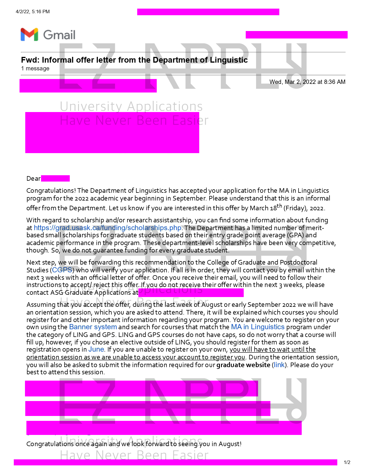 - اخذ پذیرش توسط تیم «ایزی اپلای» در مقطع کارشناسی ارشد در رشته «زبان شناسی» از «University of Saskatchewan» در کانادا برای ترم پاییز 2022
