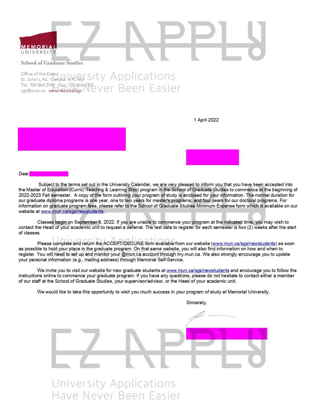- اخذ پذیرش توسط تیم «ایزی اپلای» در مقطع کارشناسی ارشد در رشته «اموزش و مطالعات یادگیری» از «Memorial University of Newfoundland» در کانادا برای ترم پاییز 2022