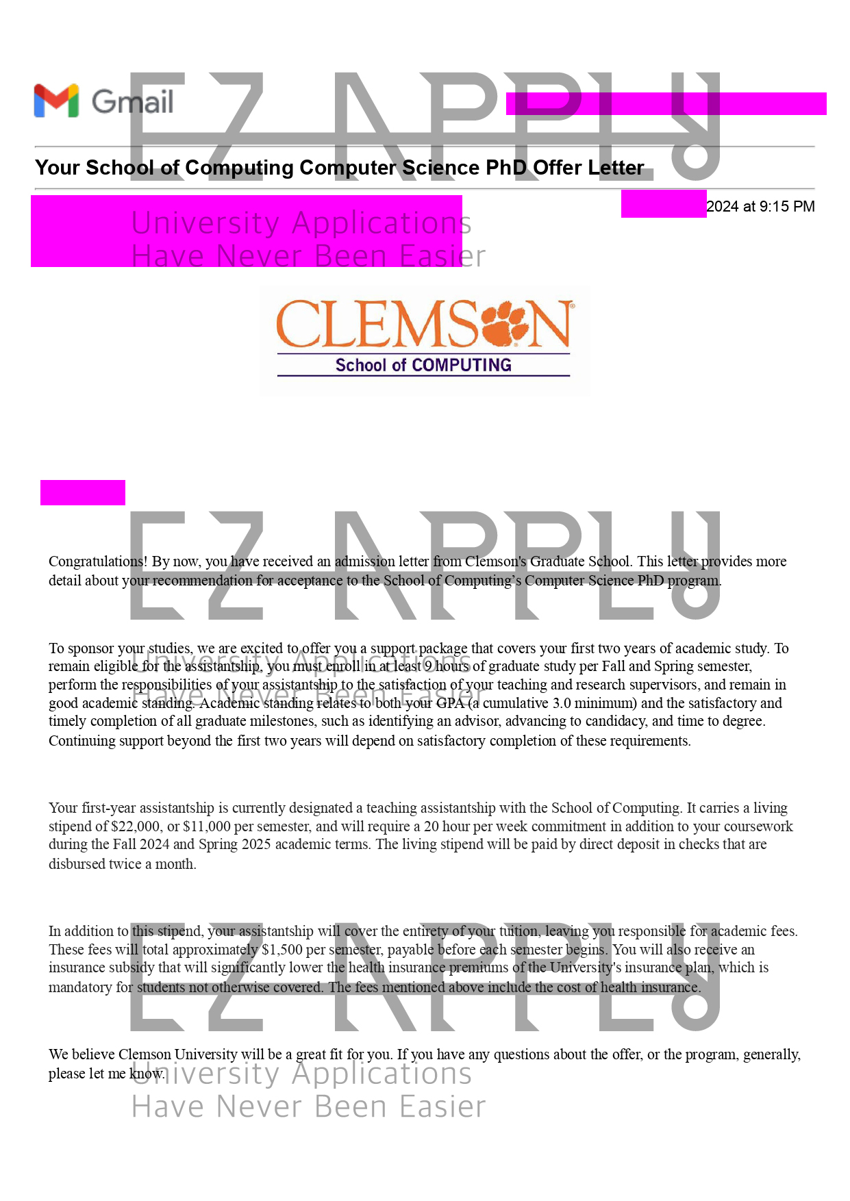 ادمیشن فول فاند اخذ شده در مقطع «دکتری» در رشته «Computer Science» از Clemson University در آمریکا برای پاییز 2024