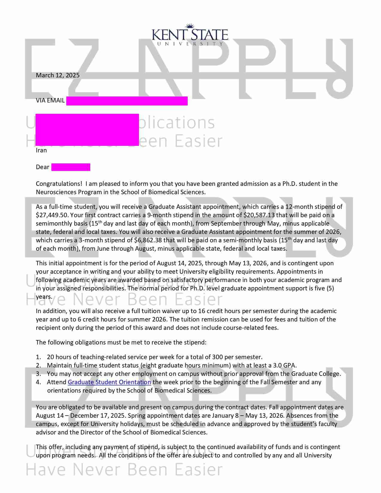 اخذ ادمیــشن فول فاند توسط تیم ایزی اپلای در مقطع «دکتری» در رشتهی «Neuroscience» از Kent State University در آمریکا برای پاییز ۲۰۲۵