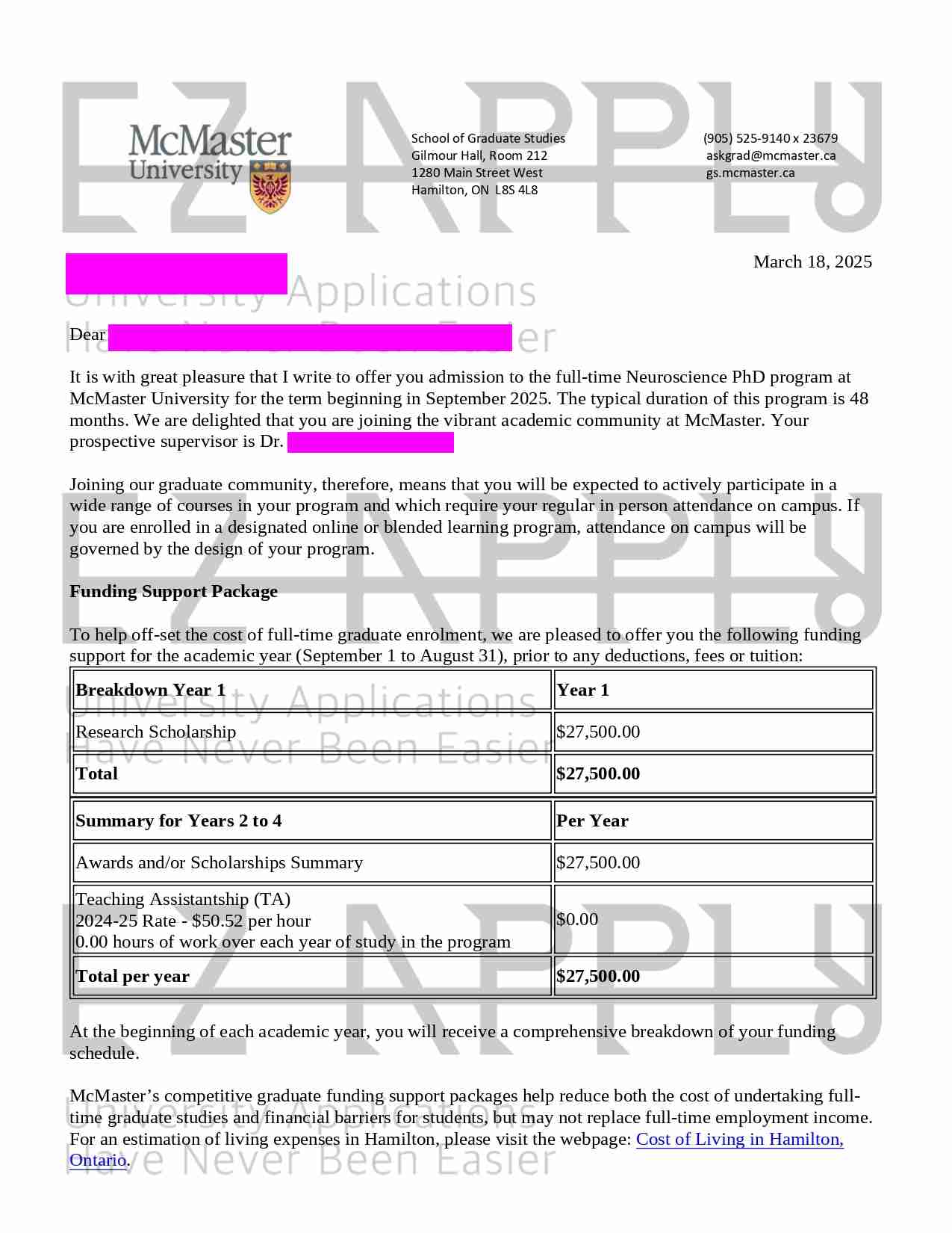 اخذ ادمیــشن فول فاند توسط تیم ایزی اپلای در مقطع «دکتری» در رشتهی «Neuroscience» از McMaster University در کانادا برای پاییز ۲۰۲۵